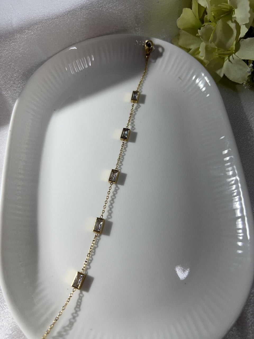 Elevate your everyday style with this Elegant Gold Baguette Charm Bracelet. Featuring delicate rectangular baguette-cut stones set in a sleek gold-plated frame, this bracelet brings a perfect balance of sparkle and sophistication.