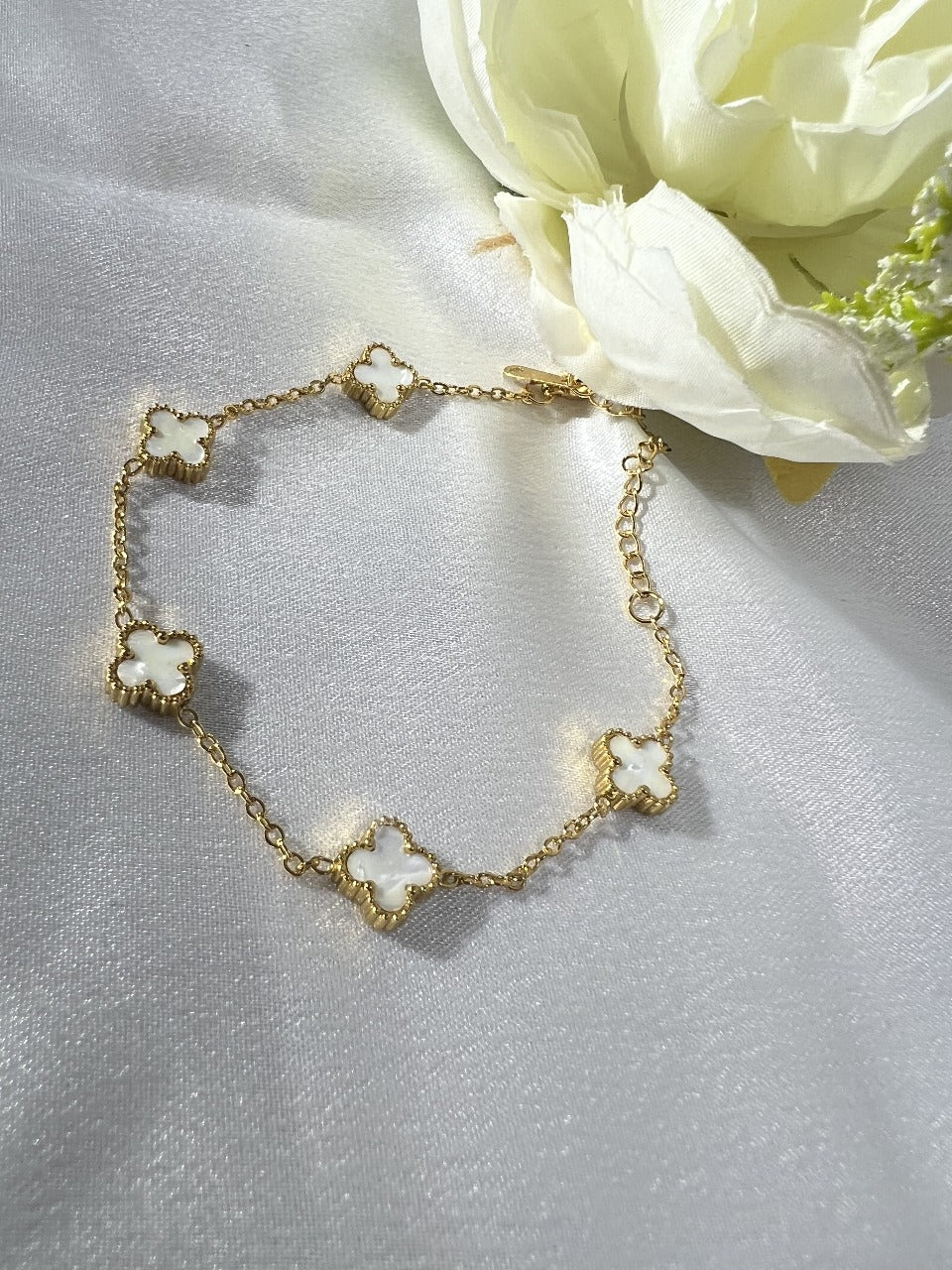 Add timeless charm to your jewelry collection with this delicate white clover bracelet. Featuring polished white enamel clover motifs set on a fine gold-tone chain, this piece brings effortless grace and modern luxury to your everyday style.