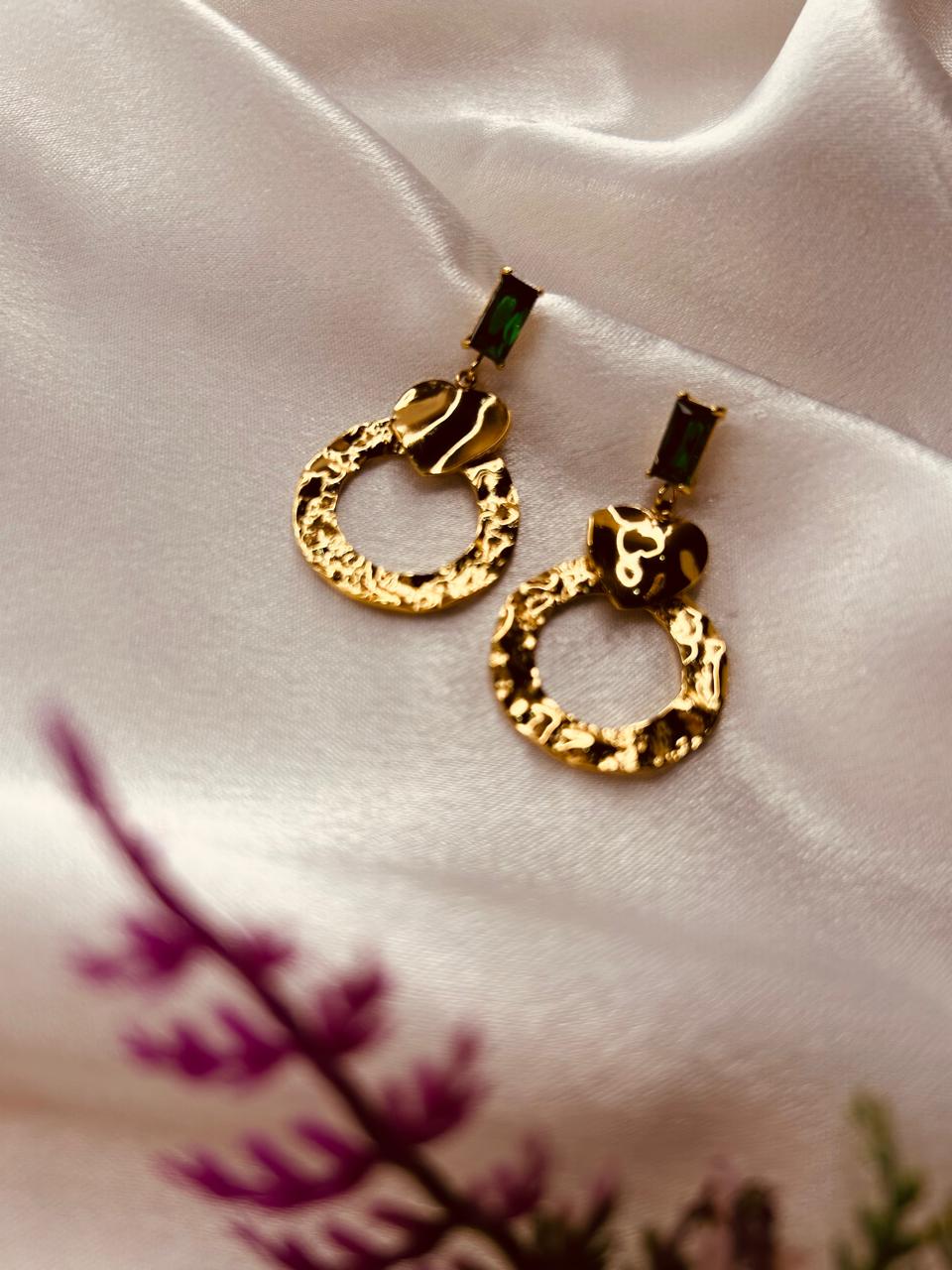 Step into elegance with our Emerald Luxe Textured Hoop Earrings — a stunning fusion of bold artistry and refined glamour. These earrings feature a hammered gold-tone hoop paired with a sculpted metallic accent, topped with a rich emerald-green stone for an elevated, royal finish.