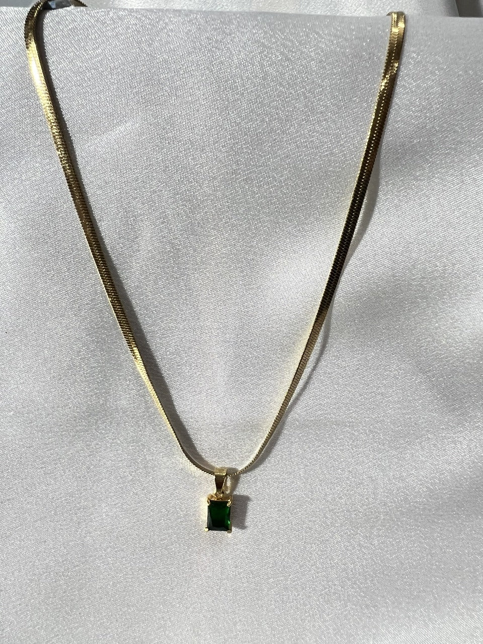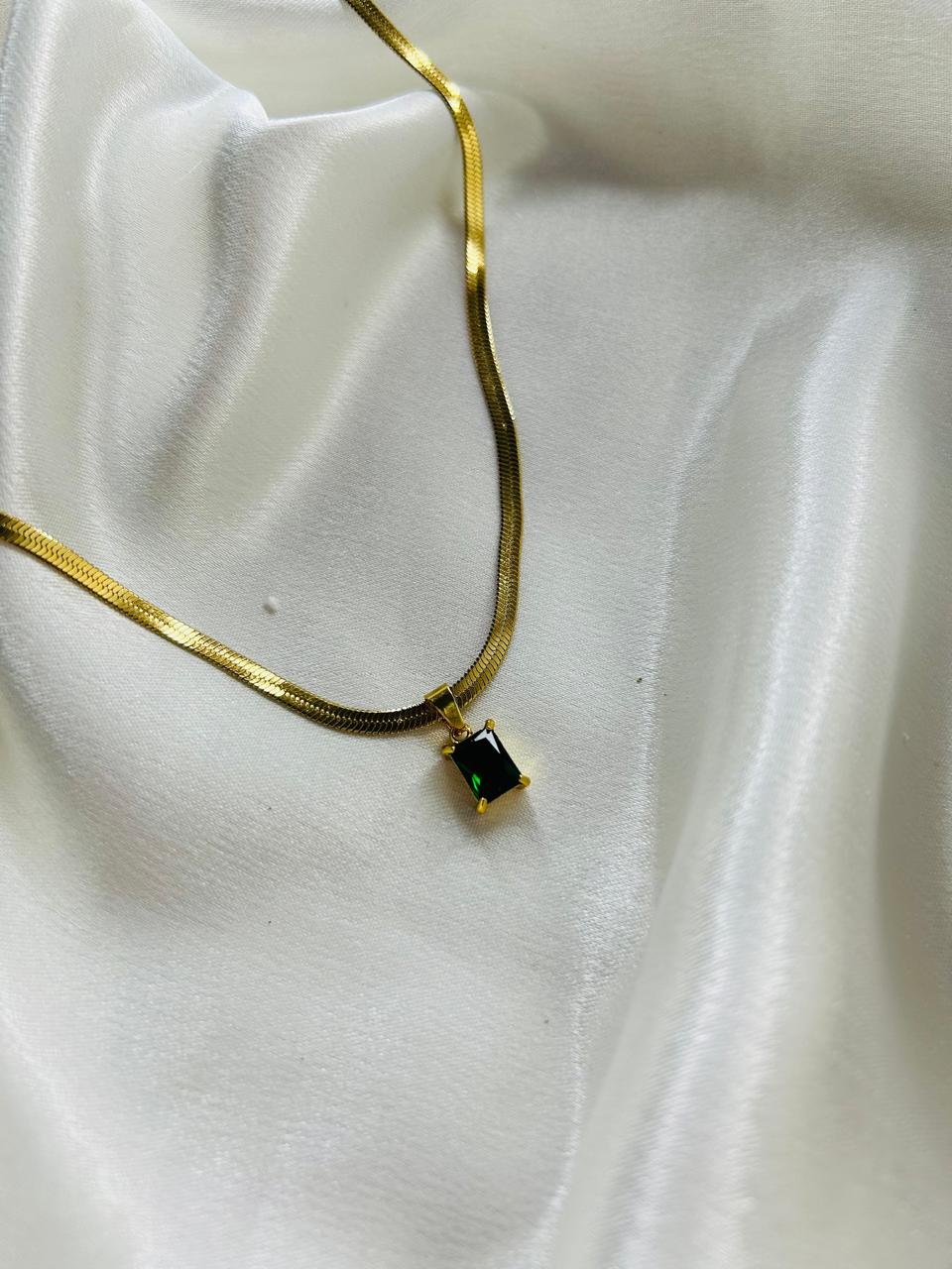 Add a touch of royal elegance to your style with our Emerald Glow Pendant Necklace. Featuring a sleek gold-tone chain paired with a striking emerald-green rectangular stone, this piece exudes timeless charm and sophistication.