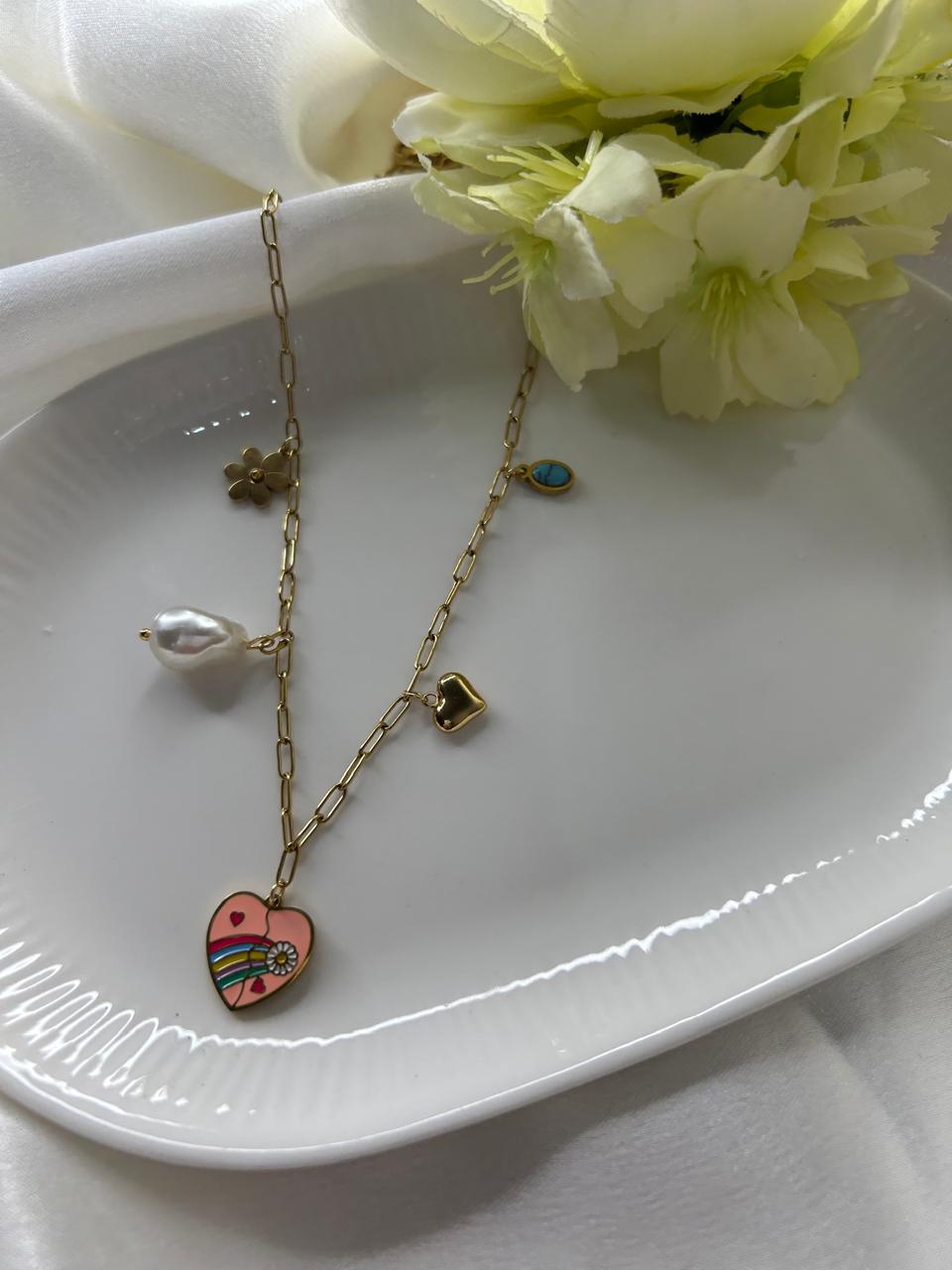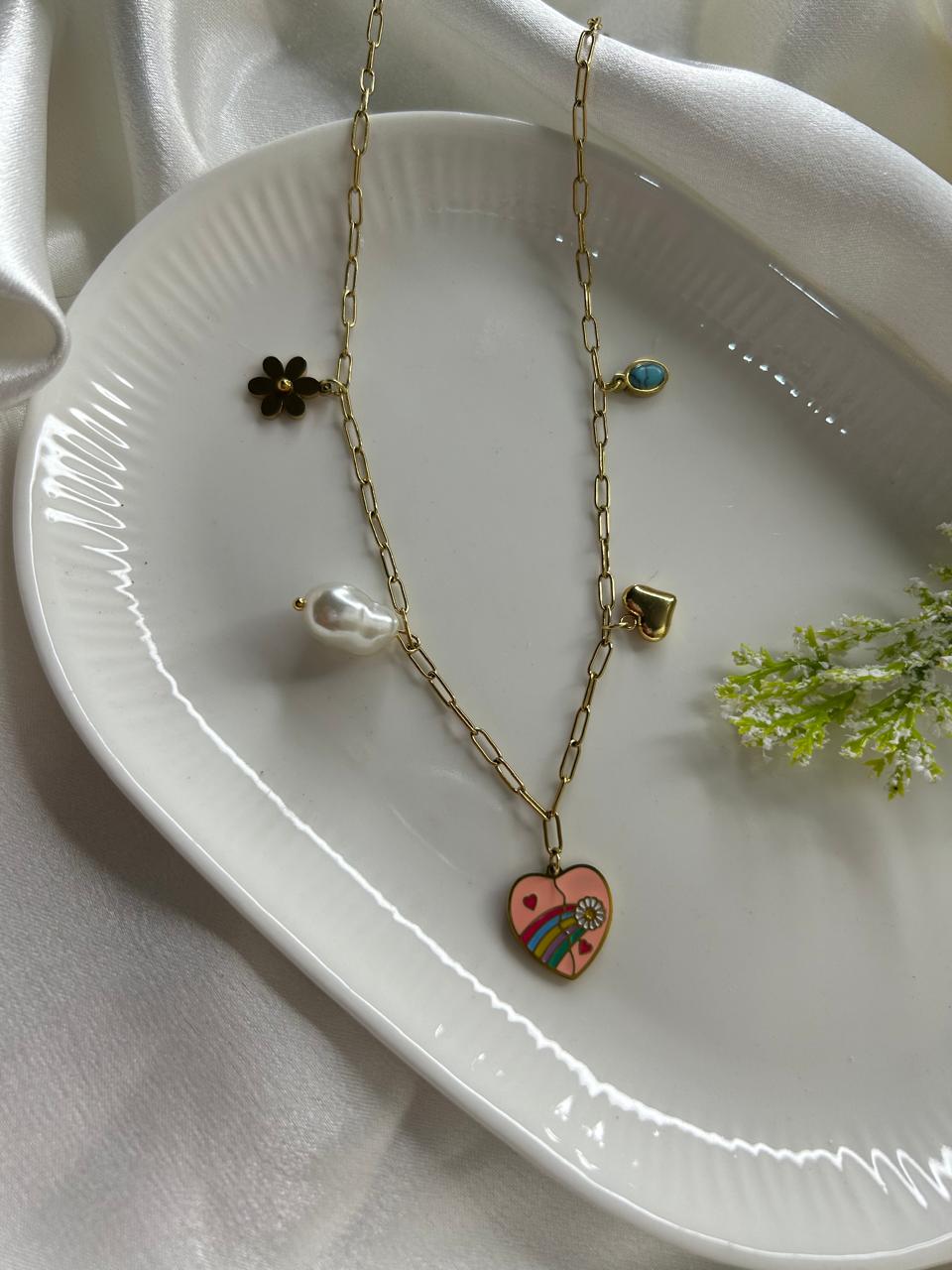 The colorful heart pendant with rainbow detailing brings a joyful, youthful vibe, while the pearl and golden charm details add a classy finish. Perfect for those who love unique jewelry that tells a story and spreads happy energy wherever it goes!